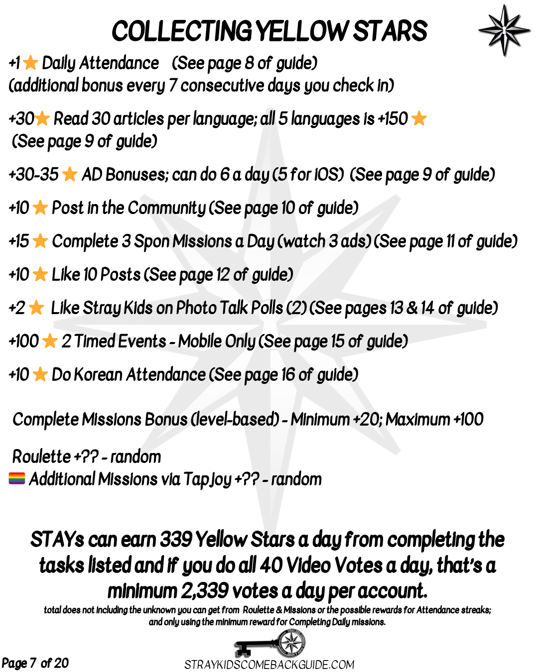 STAYs can earn 339 Yellow Stars a day from completing the tasks listed and if you do all 40 Video Votes a day, that’s a minimum 2,339 votes a day per account.